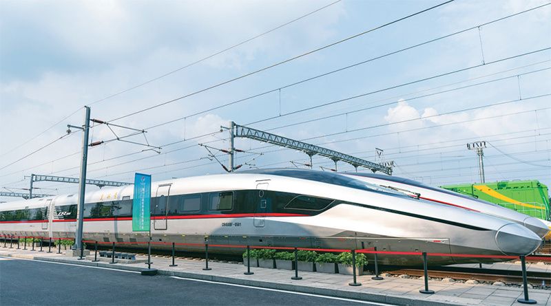 “十四五”时期,以CR450动车组为代表的一项项重大技术装备项目取得新进展、实现新突破。CR450动车组试验速度可达450公里/小时,运营速度可达400公里/小时,是全球跑得最快的高铁。图为2025年7月9日,在国家铁道试验中心展区拍摄的CR450BF动车组。 新华社记者 才扬 摄