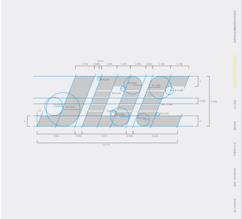 制图规范对品牌标识的整体造型比例、空间距离、线条轮廓的走向、角度等关系均作出了精确的规定。此图形为制图参考规范,实际应用中直接使用标准图形矢量(CDR)文件,不得变形失量,保持品牌标识规范应用的严肃性。